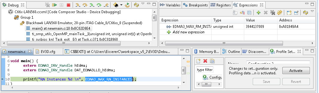 As soon as uncommenting the openmp-specific parts of the cfg-file and linking against rts6600_elf_mt.lib instead of rts6600_elf.lib, the following code prints instead of 8 some undefined negative value: