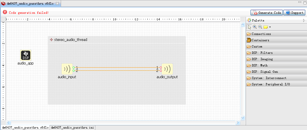 I am starting to use the C6Flo for the CCSv5.2 and I've encountered a problem in the example. I started a new project and selected the C6Flo Example: dm6437_audio_passthrough.
