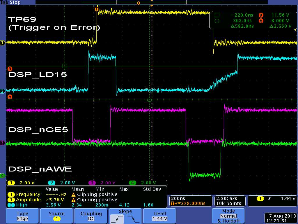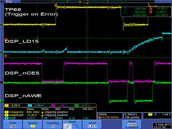 Attached images show the signals in scope for debug: Channel 1 is our internal debug signal, channel 2 is pinmux8 EMA_D[15]/GP3[7], channel 3 is chip select signal, and channel 4 is write enable signal. A slow rising rate of EMA_D[15] ( channel 2, DSP_LD15 ) is observed when DSP_nAWE and DSP_nCE5 signals are triggered. This will lead to incorrect results in FPGA. Can you help to give any advice for us to improve it? Thank you.