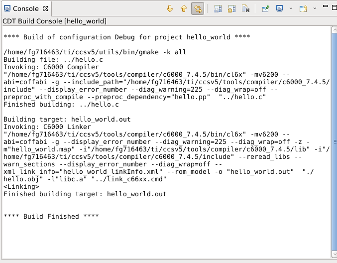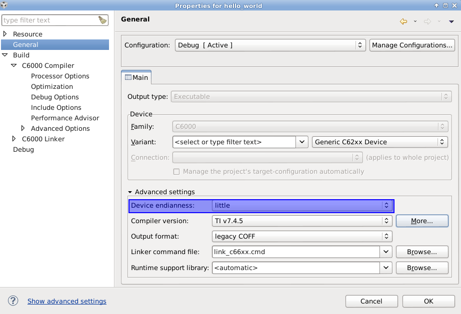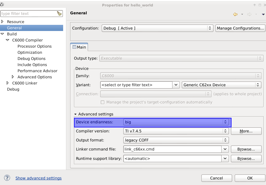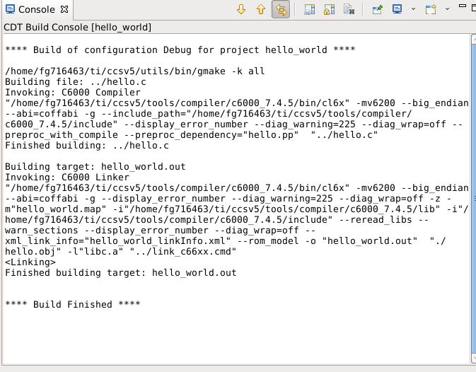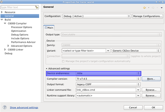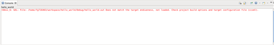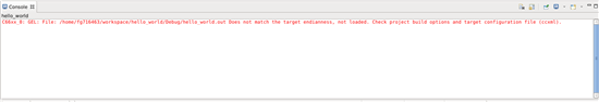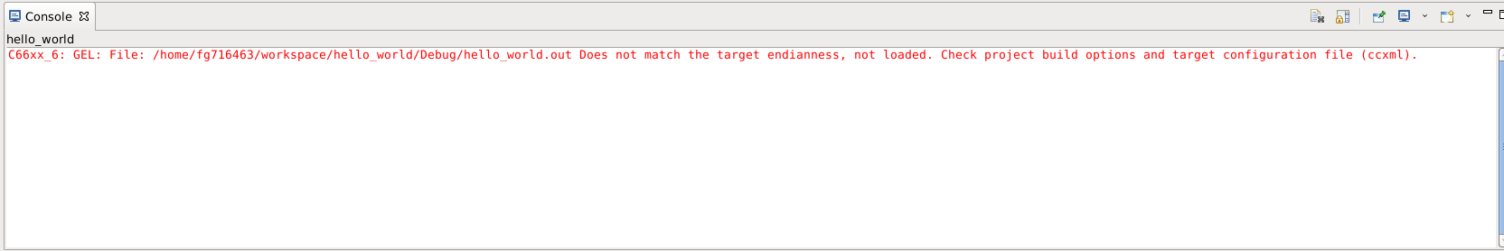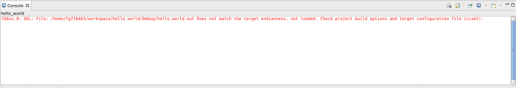C66xx_6: GEL: File: /home/fg716463/workspace/hello_world/Debug/hello_world.out Does not match the target endianness, not loaded. Check project build options and target configuration file (ccxml).