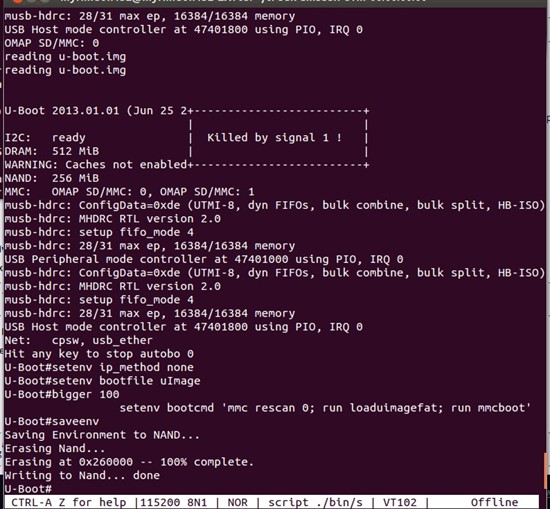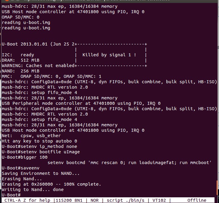 I ignored this at first and tried to boot from SD but when the kernel boots it just randomly stops after some time, sometimes it goes pretty far in the process of booting the kernel, and sometimes it stops after 1 second. I don't know but could this be because of the "killed by signal 1" when i ran the setup script?