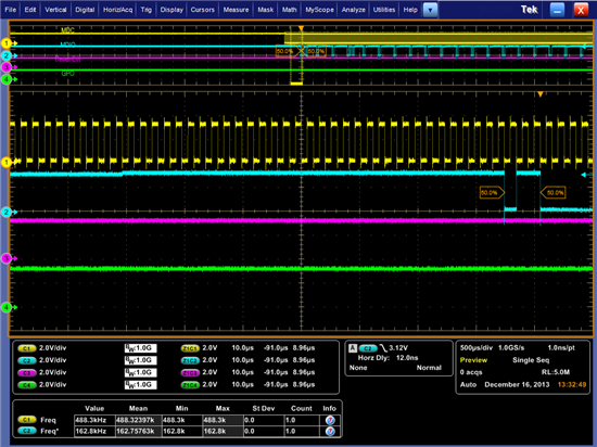 Then after about 50ms more, we see the MDIO begin to poll the registers on all 32 PHY addresses looking for the right PHY IDs. Sadly, it seems to find all Fs instead: