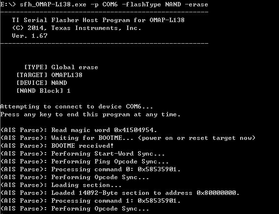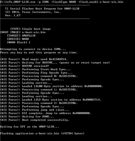 sfh_OMAP-L138.exe -p COM6 -flashType NAND -flash_noubl u-boot-ais.bin