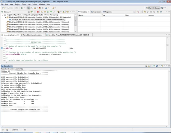 Recently I want to develope emac loopback utility for C6678.For this I use <PDK_INSTALL_DIR>\ti\drv\exampleProjects\PA_emacExample_exampleProject . And I modify it ,then treat one as Sender,one as Receiver,and configure them all in Master Mode.