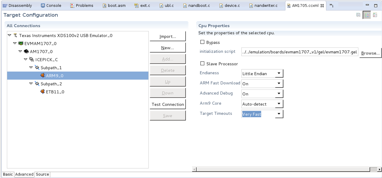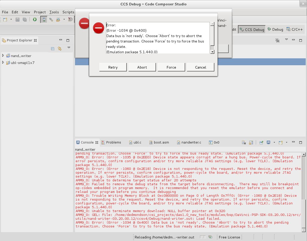 While adding some POST testing to the UBL code we introduced an exception very early in the boot process from NAND. Once the exception occurs I cannot access memory and cannot load nandwriter to recover this board. I believe the correct thing to do is to get the GEL file to correct the error condition. So far I have not been able to get the GEL loaded.