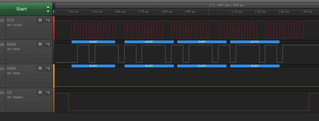 void spiInit(void){ SPSA2 = SPCR2_SUB; SPCR22->raw = 0x0000; /* Erase SPCR2 */ SPCR22->bits.grst = 0; /* go into global reset */ SPCR22->bits.xrst = 0; /* put the tx into reset */ SPSA2 = SPCR1_SUB; SPCR12->raw = 0x000; SPCR12->bits.rrst = 0; /* Receiver in reset state */ SPCR12->bits.clkstp = 0x2; /* Set clock to be running only when we have transaction */ SPSA2 = PCR_SUB; PCR2->raw = 0x0000; PCR2->bits.fsxm = 1; /* frame synchro from the sample rate generator */ PCR2->bits.clkxm = 1; /* we are master so we transmit the tx clock */ PCR2->bits.clkrm = 1; /* we are master so we transmit the rx clock */ PCR2->bits.fsxp = 1; /* frame synchro is active low */ PCR2->bits.clkxp = 1; /* clock polarity is high*/ SPSA2 = SRGR1_SUB; SRGR12->raw = 0x0000; SRGR12->bits.clkgdv = 100; /* CPU internal clk is 100MHz /100 -> spi runs at 1MHz*/ SPSA2 = SRGR2_SUB; SRGR22->raw = 0x0000; SRGR22->bits.clksp = 0; /* clock polarity on raising edges edges */ SRGR22->bits.clksm = 1; /* sample rate generator derived from CPU clock */ SRGR22->bits.fsgm = 0; SPSA2 = XCR1_SUB; XCR12->raw = 0x0000; XCR12->bits.xfrlen1 = 0; /* 1 word per frame */ XCR12->bits.xwdlen1 = 0; /* 8 bits per words */ SPSA2 = XCR2_SUB; XCR22->raw = 0x0000; XCR22->bits.xdatdly = 1; /* one bit data delay on tx */ SPSA2 = RCR1_SUB; RCR12->raw = 0x0000; RCR12->bits.rfrlen1 = 0; /* 1 word per frame */ RCR12->bits.rwdlen1 = 0; /* 8 bits per words */ SPSA2 = RCR2_SUB; RCR22->raw = 0x0000; RCR22->bits.rdatdly = 1; /* one bit data delay on tx */ asm(" NOP"); SPSA2 = SPCR2_SUB; SPCR22->raw = 0x0000; SPCR22->bits.grst = 1; /* leaving global reset */ SPCR22->bits.xrst = 1; /* leaving TX reset */ asm(" NOP"); } void spiTxByte(unsigned char byte){ int empty = 1; /* wait for TX to be completed */ while(empty == 1){ SPSA2 = SPCR2_SUB; empty = SPCR22->bits.xempty; } /* transmit the actual data */ DXR12 = (unsigned int)byte; } void spiTxBytes(unsigned char* byte, int len) { int i; int ready = 0; /* wait for TX to be ready */ while(ready == 0){ SPSA2 = SPCR2_SUB; ready = SPCR22->bits.xrdy; } SPSA2 = XCR1_SUB; XCR12->bits.xfrlen1 = len-1; /* word per frame */ for (i=0; i<len;i++){ spiTxByte((unsigned int)(*byte)); byte++; } }