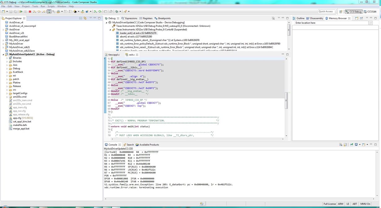 So, we launch the test: start the code in debug mode on the 2 dsp, start the master with KPA Studio, scan the bus, find the 2 slaves, attach the slaves….. After a little time, an exception occurs on the dsp1 (you can see the screenshot in attachment).