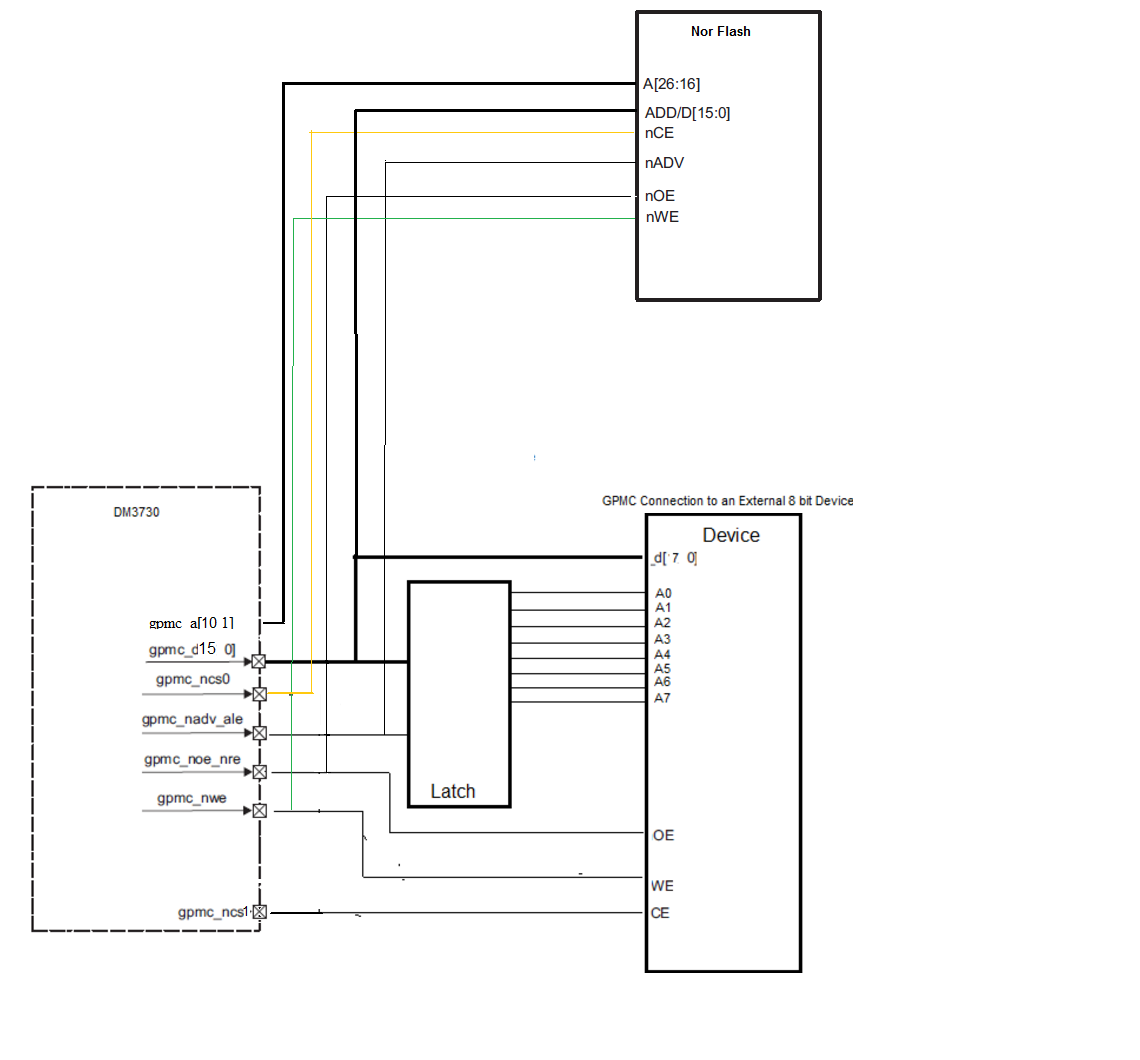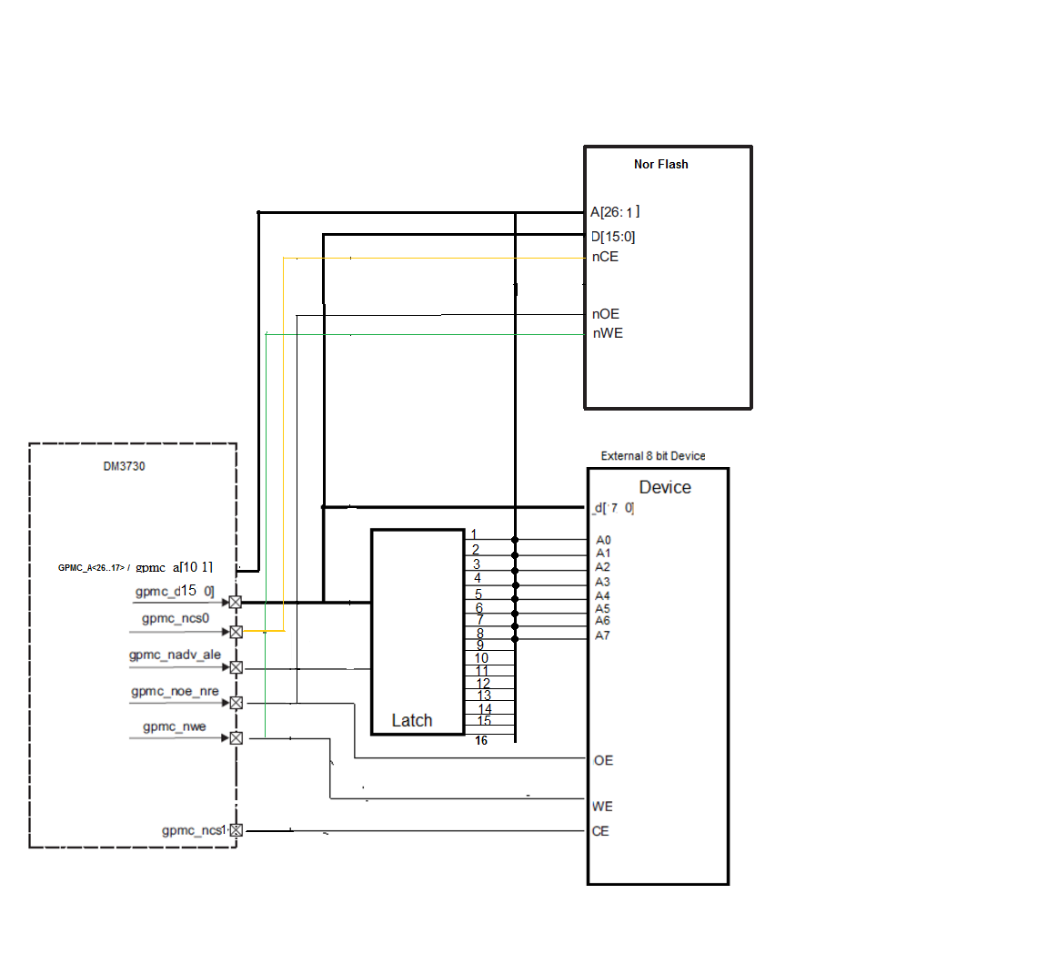 We want to connect GPMC interface of DM3730 to 8 bit device and Nor flash. Can we do these connections like the attached file ?