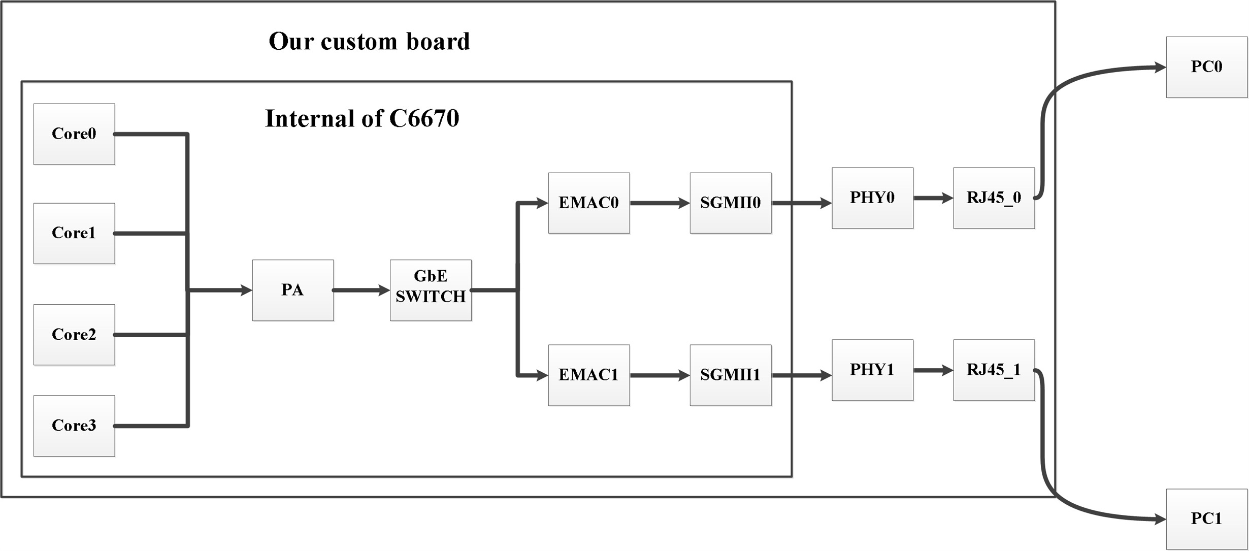 On my custom board, the C6670 is connected to two PHYs(88E1111) using SGMII0 and SGMII1 ports respectively. The followed figure shows some details of my board.