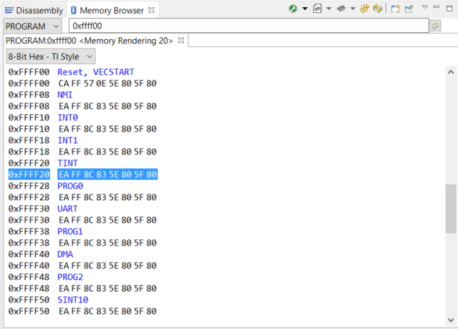 - Loaded the assembled code into dev platform to be debugged. Proceeded to the ‘Memory Browser’ to validate the interrupt vector table located at ROM (PROGRAM) address 0xFFFF00. This is where I notice only the Reset has a valid 8-byte entry?