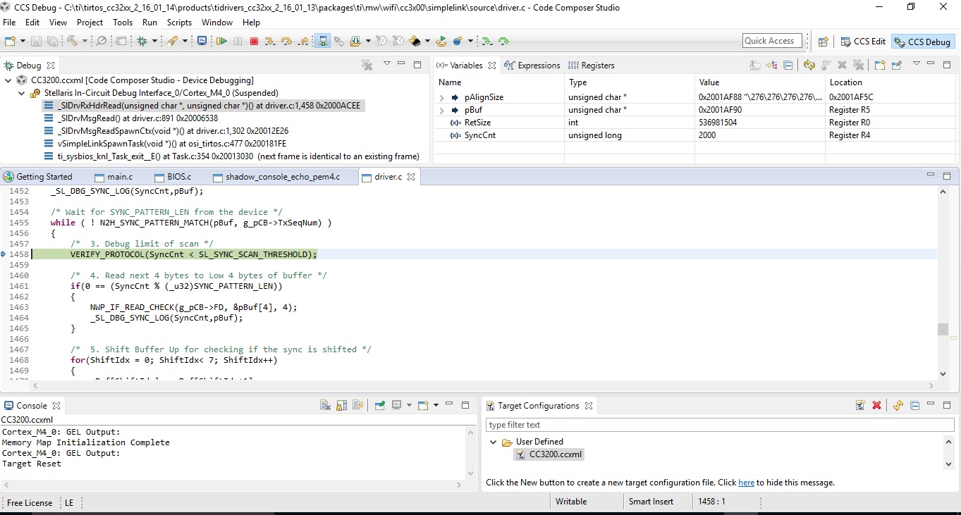 While running any of the sample_apps, the program gets stuck at VERIFY_PROTOCOL(SyncCnt < SL_SYNC_SCAN_THRESHOLD); in the driver.c file. It goes into endless loop on the same line with SyncCnt value shown as 2000. Please help me getting past through this.