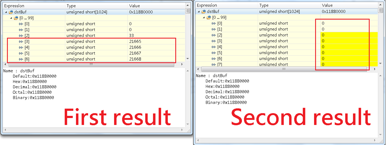 Only first result (rx buffer) has non-zero value, others are zero value.