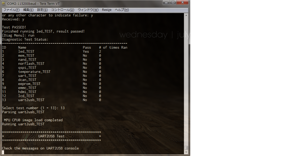 When I invoke diagnostic test for uart2usb, the control does not come back to console. Here is a snapshot.