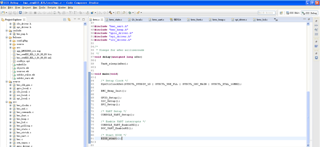 I download the C code of BMC,but when I look it in CCS6.2 ,BIOS_start function cann't find in main function. Please help me to unstand the C code.