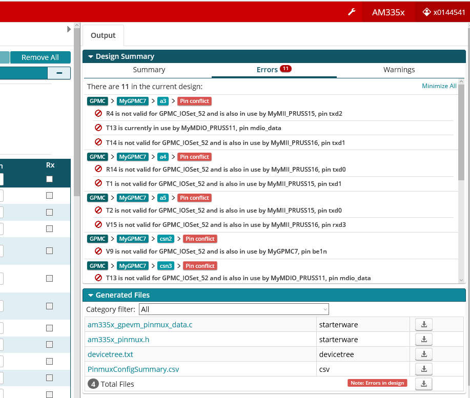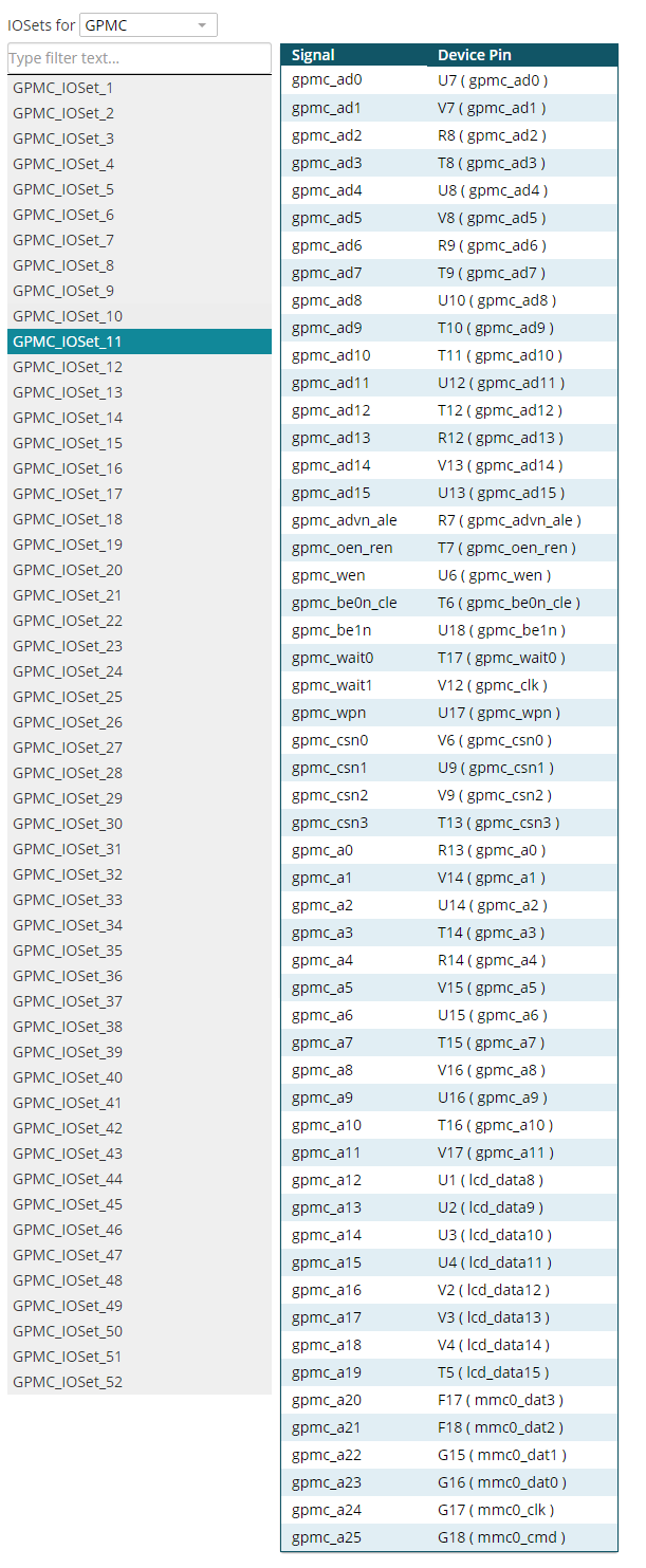The file I have sent to you is a working file, so every problem is in proccess to be solve, either changing pinout (that is the case of the GPIO peripheral) or adding external logic (that is the solution I have thought for having additional CS in GPMC peripheral). But the bigger problem is signal WAIT0, as we are not using this pin for MII1_PRU1, but Pinmux doesn't allow us to use it for GPMC. So the question is: