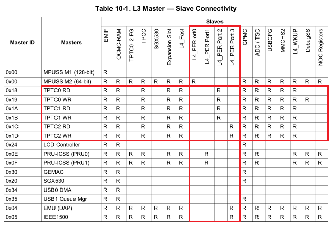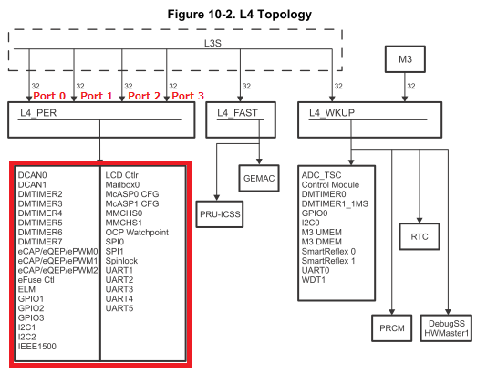 In TRM (SPRUH73P), Table 10-1 shows the required L3 connections between bus masters and slave ports and Figure 10-2 shows the L4 bus architecture and memory-mapped peripherals.
