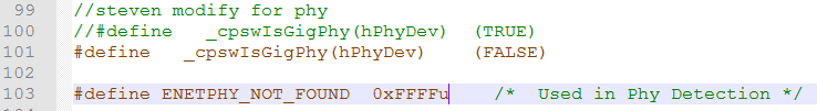 Change the _cpswIsGigPhy definition from TRUE to FLASE, as this is not the gigabit Ethernet.