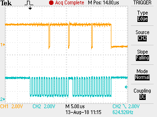 This is a waveform between 0xF3 and 0xF4, there is a negtive pulse between the two bytes.