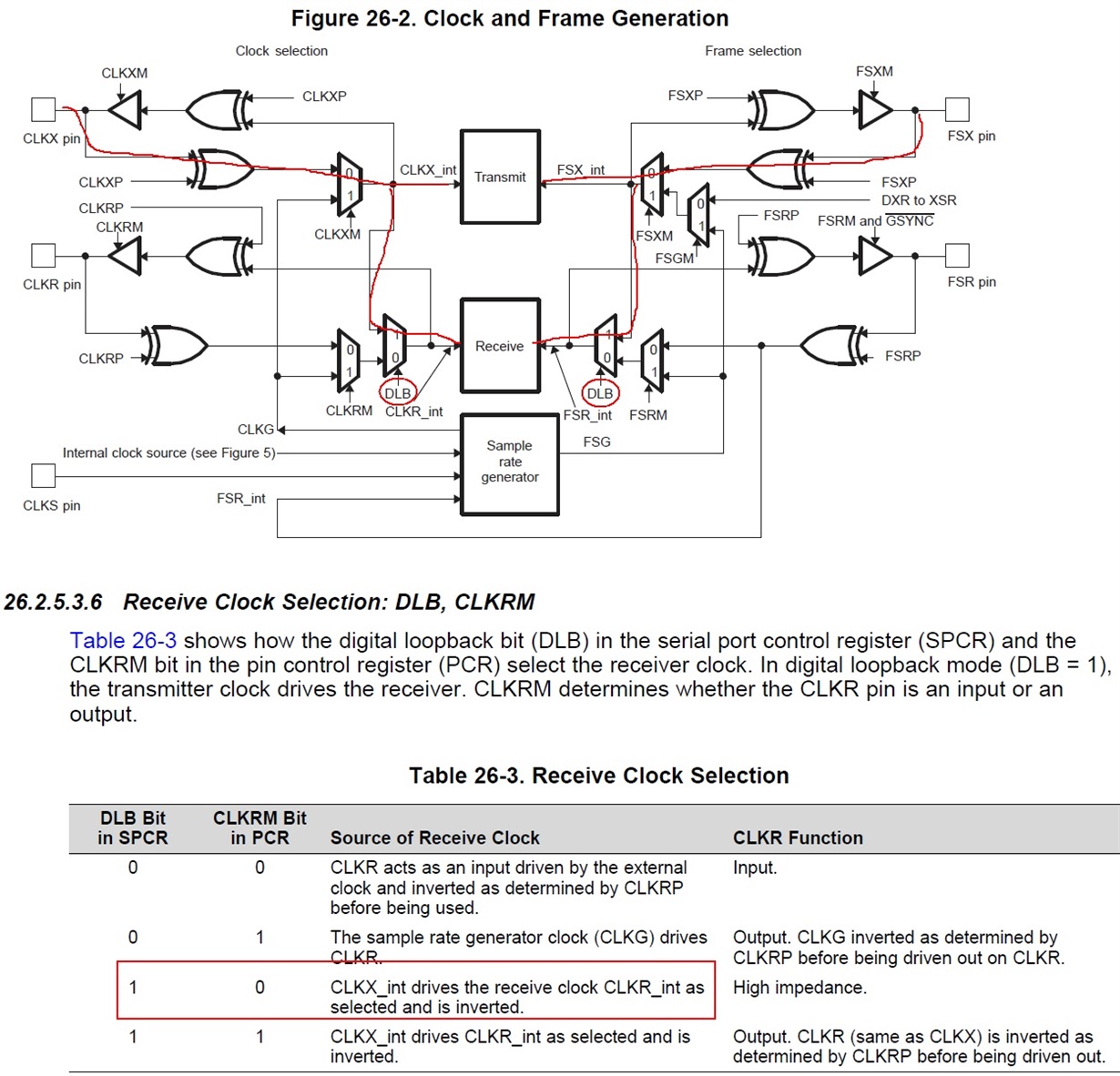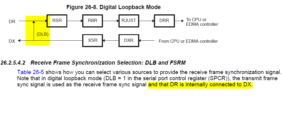 #2. Connect only CLKX to BCLK, FSX to FS, leave McBSP CLKR and FSR unconnected? and configure as below snapshot? in the DLB mode, receiver can share clock and FS with transmitter, but DX and DR also connected internally. so this configuration doesn't work.