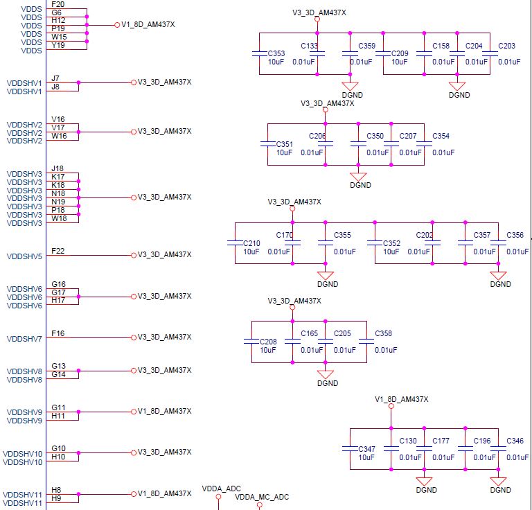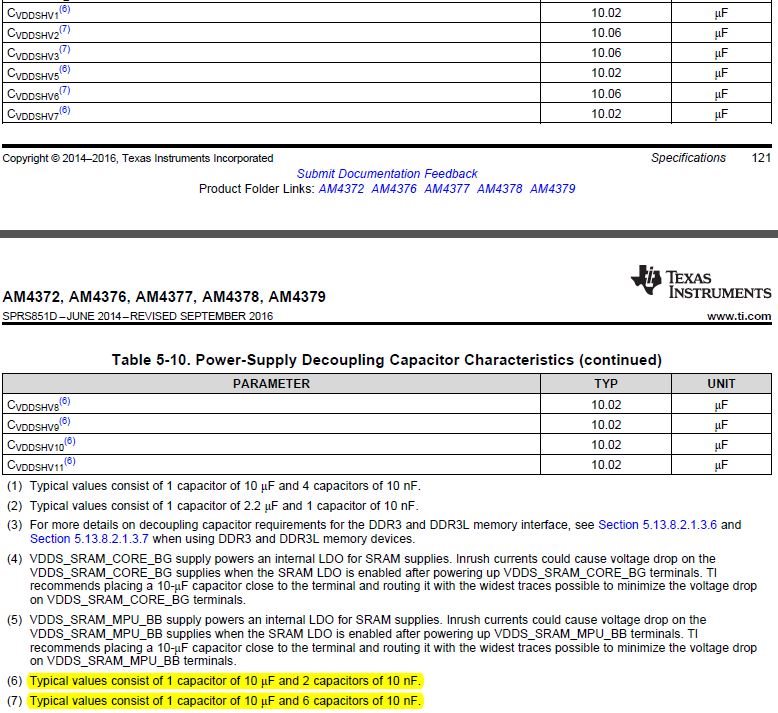 According to AM4376 datasheet table5-10 external capacitor part, flor VDDSHV1~VDDSHV11, there are total 32 0.01 uF capacitor required. But according to GP EVM show, there are 21 amount of 0.01 uF capacitor, are some capacitors shared by different VDDSHVx pins to ensure each VDDSHV pin meets requirement of datasheet table? If it is not allowed, it seems that GP EVM external capacitor design doesn't fully follow up datasheet info, could you clarify on this?