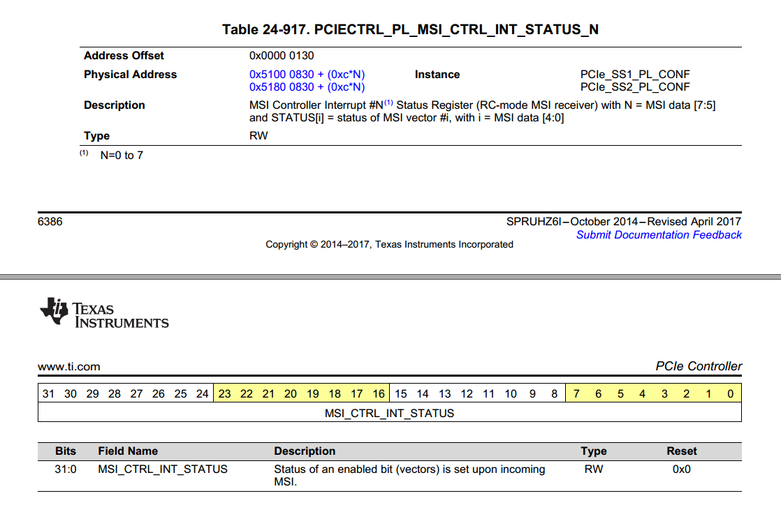 The FPGA send the MSI vector from 0 to 31 to the AM5728, and I want to distinguish which the MSI vector that the DSP got.I look into am5728 Technical Reference Manual < 24.9 PCIe Controller>,but I not find the register that I want.