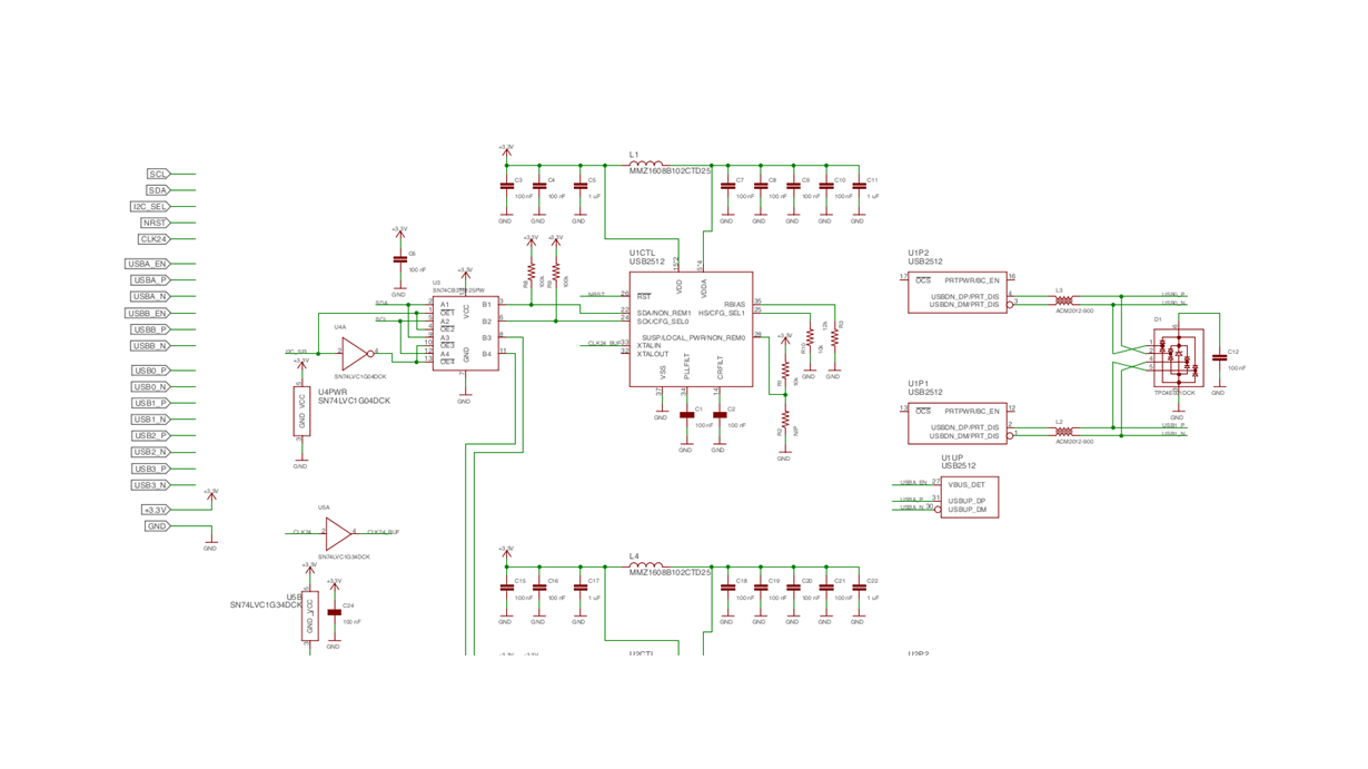 The USB2512 chip that is connected to USB0 is properly powered and configured over I2C. Yet when programmed and the usb drivers loaded, it is not detected and enumerated at all.