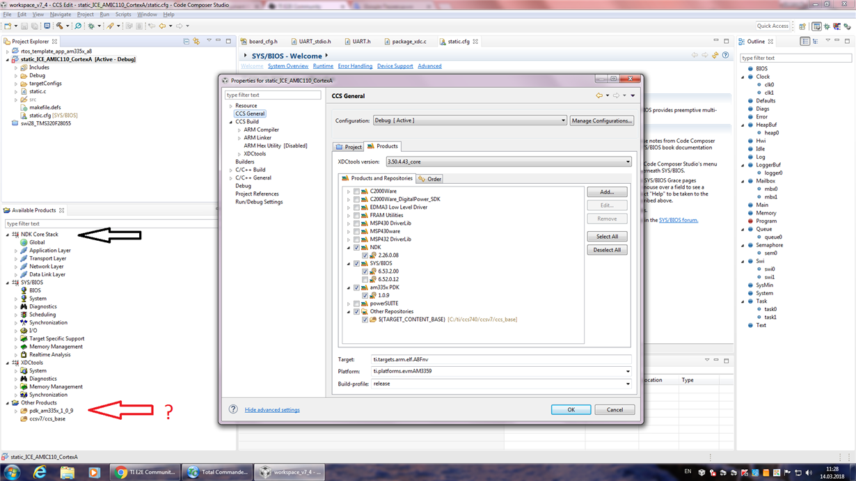 I bought the kit TMDXICE110. From Resource Explorer Classic in my CCS, I'm imported project "static_ICE_AMIC110_CortexA". It's project a good compiling and working on platform through JTAG. I am also installed NDK_2_26_00_08 and PDK_am335x_1_0_9 in C:\ti\ directory on my PC. The picture below shows how the NDK and PDK are connected. It seems like everything is correct?