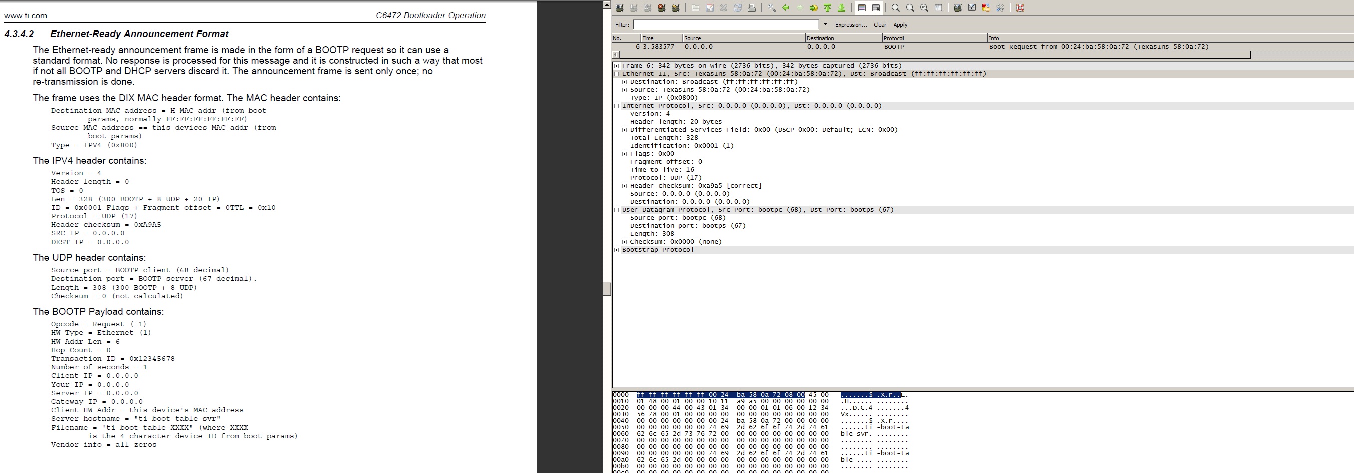 I am able to get the 6474evm to generate a BOOTP packet. However, I am finding it difficult to actually read the packet. Using windows sockets and lwIP TCP/IP stack I find that the BOOTP packet doesn't make it through the stack. I can see it on a packet sniffer but would like to boot the DSP by responding to the packet.