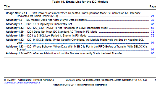 I saw there was some further activity and workarounds suggested in Oct 2016. There was some mention of re-spinning the I2C peripheral HW.