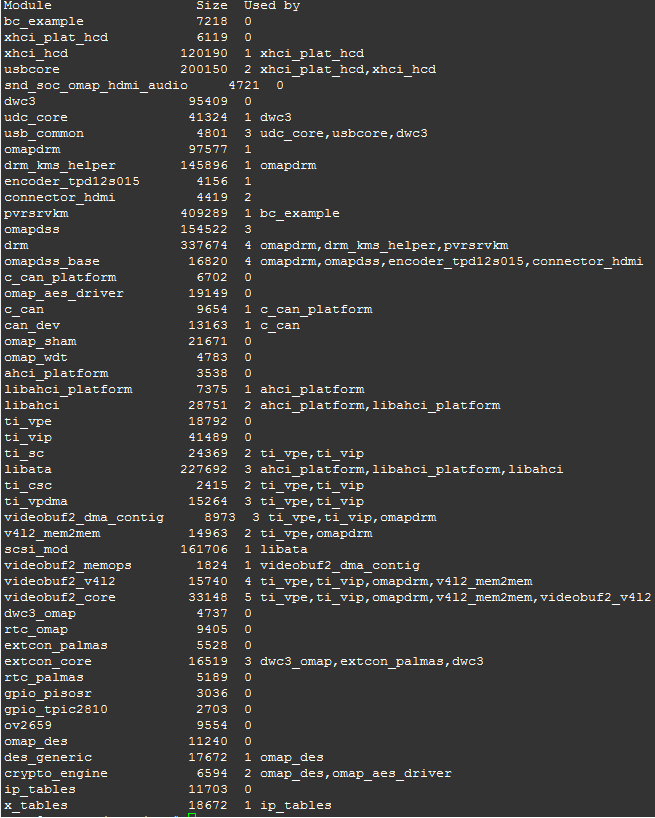 I was trying to install Xorg compatible GPU driver on my Sitara AM5728 IDK. I came to know that there is a GPU driver source file in a folder "ti-sgx-ddk-km-1.14.3699939", which comes with the TI SDK for Sitara AM57xx SoC. I have managed to compile the source and this process produced two kernel modules file "bc_example.ko and pvrsrvkm.ko" as an output. I have loaded these kernel modules, as you may see in the lsmod snapshot below
