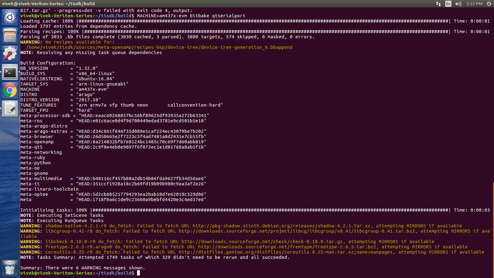 WARNING: linux-libc-headers-4.9-r0.arago2 do_fetch: Failed to fetch URL git://git.ti.com/ti-linux-kernel/ti-linux-kernel.git;protocol=git;branch=ti-lsk-linux-4.9.y, attempting MIRRORS if available ERROR: linux-libc-headers-4.9-r0.arago2 do_fetch: Fetcher failure: Fetch command export DBUS_SESSION_BUS_ADDRESS="unix:abstract=/tmp/dbus-2uZ0tDpHHk"; export SSH_AUTH_SOCK="/run/user/1000/keyring/ssh"; export PATH="/home/vivek/tisdk/sources/oe-core/scripts:/home/vivek/tisdk/build/arago-tmp-external-linaro-toolchain/sysroots/x86_64-linux/usr/bin/arm-linux-gnueabi:/home/vivek/tisdk/build/arago-tmp-external-linaro-toolchain/sysroots/am57xx-evm/usr/bin/crossscripts:/home/vivek/tisdk/build/arago-tmp-external-linaro-toolchain/sysroots/x86_64-linux/usr/sbin:/home/vivek/tisdk/build/arago-tmp-external-linaro-toolchain/sysroots/x86_64-linux/usr/bin:/home/vivek/tisdk/build/arago-tmp-external-linaro-toolchain/sysroots/x86_64-linux/sbin:/home/vivek/tisdk/build/arago-tmp-external-linaro-toolchain/sysroots/x86_64-linux/bin:/home/vivek/gcc-linaro-6.2.1-2016.11-x86_64_arm-linux-gnueabihf/bin:/home/vivek/gcc-linaro-6.2.1-2016.11-x86_64_arm-linux-gnueabihf/bin:/home/vivek/tisdk/sources/meta-ros/scripts:/home/vivek/tisdk/sources/meta-browser/scripts:/home/vivek/tisdk/sources/oe-core/scripts:/home/vivek/tisdk/sources/bitbake/bin:/home/vivek/bin:/home/vivek/.local/bin:/usr/local/sbin:/usr/local/bin:/usr/sbin:/usr/bin:/sbin:/bin:/usr/games:/usr/local/games:/snap/bin"; export HOME="/home/vivek"; LANG=C git -c core.fsyncobjectfiles=0 clone --bare --mirror git://git.ti.com/ti-linux-kernel/ti-linux-kernel.git /home/vivek/tisdk/downloads/git2/git.ti.com.ti-linux-kernel.ti-linux-kernel.git --progress failed with exit code 128, output: Cloning into bare repository '/home/vivek/tisdk/downloads/git2/git.ti.com.ti-linux-kernel.ti-linux-kernel.git'... fatal: unable to connect to git.ti.com: git.ti.com[0: 198.47.28.208]: errno=Connection refused ERROR: linux-libc-headers-4.9-r0.arago2 do_fetch: Fetcher failure for URL: 'git://git.ti.com/ti-linux-kernel/ti-linux-kernel.git;protocol=git;branch=ti-lsk-linux-4.9.y'. Unable to fetch URL from any source. ERROR: linux-libc-headers-4.9-r0.arago2 do_fetch: Function failed: base_do_fetch ERROR: Logfile of failure stored in: /home/vivek/tisdk/build/arago-tmp-external-linaro-toolchain/work/armv7ahf-neon-linux-gnueabi/linux-libc-headers/4.9-r0.arago2/temp/log.do_fetch.12526 ERROR: Task (/home/vivek/tisdk/sources/meta-arago/meta-arago-distro/recipes-kernel/linux-libc-headers/linux-libc-headers_4.9.bb:do_fetch) failed with exit code '1' NOTE: Tasks Summary: Attempted 327 tasks of which 325 didn't need to be rerun and 1 failed. Summary: 1 task failed: /home/vivek/tisdk/sources/meta-arago/meta-arago-distro/recipes-kernel/linux-libc-headers/linux-libc-headers_4.9.bb:do_fetch Summary: There were 2 WARNING messages shown. Summary: There were 3 ERROR messages shown, returning a non-zero exit code.