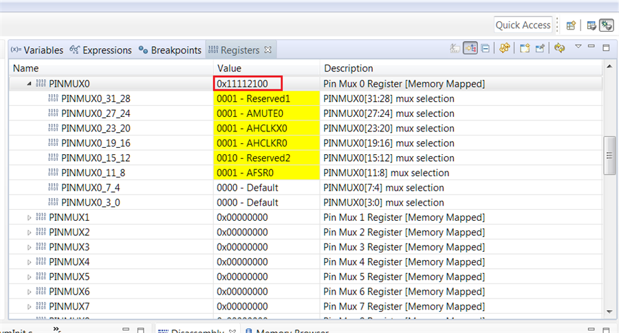 I am trying to add another GPIO output pin in an existing project. The pin is bank 1 pin 12. However, setting the direction to output and setting the pin high does not have any affect. I noticed that there is a patch of code in a configuration routine that sets values for the PINMUX1 through PINMUX19 registers as defined in evmc6747.h. I suspect that this configuration is related to why I cannot manipulate the pin. Is there documentation on how these values are determined and used? My DSP/BIOS version is 5.42.109 and I am using version 5.5.0.00077 of Code Composer. Below is a the code that sets these values.