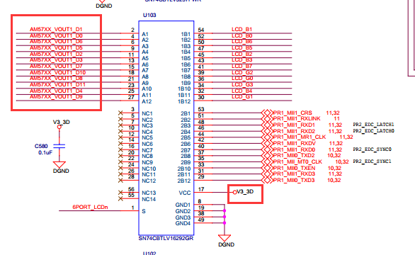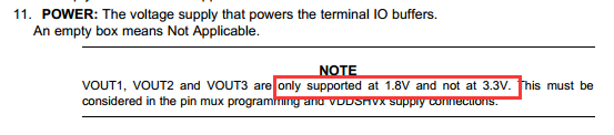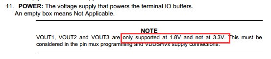 I am looking the datasheet for AM5718,the page12 of datasheet 11. POWER: noted VOUT1, VOUT2 and VOUT3 are only supported at 1.8V and not at 3.3V. When I look the AM571x EVM Schematic,in the page 20,AM5728 VOUT1 PIN connect to SN74CBTLV16292GR,and this chip VCC is 3.3V. I'm puzzled,If VOUT1 can support 3.3V?