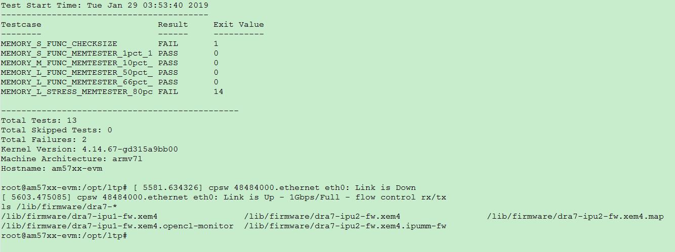 root@am57xx-evm:/opt/ltp# root@am57xx-evm:/opt/ltp# /opt/ltp/runltp -P am57xx-evm -f ddt/memtest -t 1h INFO: creating /opt/ltp/results directory INFO: Filtering testscenarios based on am57xx-evm capabilities Checking for required user/group ids 'nobody' user id and group found. 'bin' user id and group found. 'daemon' user id and group found. Users group found. Sys group found. Required users/groups exist. If some fields are empty or look unusual you may have an old version. Compare to the current minimal requirements in Documentation/Changes. ID="arago" NAME="Arago" VERSION="2018.08" VERSION_ID="2018.08" PRETTY_NAME="Arago 2018.08" Linux am57xx-evm 4.14.67-gd315a9bb00 #1 SMP PREEMPT Sat Oct 6 02:39:21 UTC 2018 armv7l GNU/Linux Gnu C gcc (Linaro GCC 7.2-2017.11) 7.2.1 20171011 Gnu make 4.2.1 util-linux linux 2.30 mount linux 2.30 (libmount 2.30.0: btrfs, assert, debug) modutils 24 e2fsprogs 1.43.5 Linux C Library > libc.2.25 Dynamic linker (ldd) 2.25 Linux C++ Library /../lib/libstdc++ Procps 3.3.12 iproute2 iproute2-ss170501 iputils 'V' Kbd 2.0.4 Sh-utils --v Modules Loaded sha512_generic sha512_arm sha256_generic sha1_generic sha1_arm_neon sha1_arm md5 cbc aes_arm_bs crypto_simd cryptd xfrm_user xfrm4_tunnel ipcomp xfrm_ipcomp esp4 ah4 af_key xfrm_algk free reports: total used free shared buff/cache available Mem: 1866020 118048 1618744 20088 129228 1702900 Swap: 0 0 0 /proc/cpuinfo processor : 0 model name : ARMv7 Processor rev 2 (v7l) BogoMIPS : 18.44 Features : half thumb fastmult vfp edsp neon vfpv3 tls vfpv4 idiva idivt vfpd32 lpae evtstrm CPU implementer : 0x41 CPU architecture: 7 CPU variant : 0x2 CPU part : 0xc0f CPU revision : 2 processor : 1 model name : ARMv7 Processor rev 2 (v7l) BogoMIPS : 18.44 Features : half thumb fastmult vfp edsp neon vfpv3 tls vfpv4 idiva idivt vfpd32 lpae evtstrm CPU implementer : 0x41 CPU architecture: 7 CPU variant : 0x2 CPU part : 0xc0f CPU revision : 2 Hardware : Generic DRA74X (Flattened Device Tree) Revision : 0000 Serial : 0800300c317200e2 no big block device was specified on commandline. Tests which require a big block device are disabled. You can specify it with option -z COMMAND: /opt/ltp/bin/ltp-pan -e -S -t 1h -a 1739 -n 1739 -p -f /tmp/ltp-XXXXLNPtvs/alltests -l /tmp/tmp.tUiZds -C /opt/ltp/output/LTP_RUN_ON-tmp.tUiZds.fai[ 1423.785762] LTP: starting MEMORY_S) led -T /opt/ltp/output/LTP_RUN_ON-tmp.tUiZds.tconf LOG File: /tmp/tmp.tUiZds FAILED COMMAND File: /opt/ltp/output/LTP_RUN_ON-tmp.tUiZds.failed TCONF COMMAND File: /opt/ltp/output/LTP_RUN_ON-tmp.tUiZds.tconf Running tests....... PAN will run for 3600 seconds <<<test_start>>> tag=MEMORY_S_FUNC_CHECKSIZE stime=1548734020 cmdline="source 'board_requirements.sh'; get_acceptable_[ 1423.837449] LTP: starting MEMORY_S_FUNC_MEMTESTER_1pct_1time (source 'functions.sh'; run_memtest 1 1) memory_size; min_mem_size=`echo "$expected_memory * 0.95 / 1" |bc`; [ $(free | grep Mem:| awk '{print $2};') -gt $min_mem_size ]" contacts="" analysis=exit <<<test_output>>> <<<execution_status>>> initiation_status="ok" duration=0 termination_type=exited termination_id=1 corefile=no cutime=2 cstime=0 <<<test_end>>> <<<test_start>>> tag=MEMORY_S_FUNC_MEMTESTER_1pct_1time stime=1548734020 cmdline="source 'functions.sh'; run_memtest 1 1" contacts="" analysis=exit <<<test_output>>> sh2185:1548734020->1548734020(0):: Testing 18M of memory 1 times memtester version 4.3.0 (32-bit) Copyright (C) 2001-2012 Charles Cazabon. Licensed under the GNU General Public License version 2 (only). pagesize is 4096 pagesizemask is 0xfffff000 want 18MB (18874368 bytes) got 18MB (18874368 bytes), trying mlock ...locked. Loop 1/1: Stuck Address : ok Random Value : ok Compare XOR : ok Compare SUB : ok Compare MUL : ok Compare DIV : ok Compare OR : ok Compare AND : ok Sequential Increment: ok Solid Bits : ok Block Sequential : ok Checkerboard : ok Bit Spread : ok Bit Flip : ok Walking Ones : ok Walking Zeroes : ok Done. sh2185:1548734020->1548734047(27):: killed cpuloadgen sh2185:1548734020->1548734049(29):: killed memtest [ 1453.178352] LTP: starting MEMORY_M_FUNC_MEMTESTER_10pct_1time (source 'functions.sh'; run_memtest 10 1) <<<execution_status>>> initiation_status="ok" duration=29 termination_type=exited termination_id=0 corefile=no cutime=2208 cstime=9 <<<test_end>>> <<<test_start>>> tag=MEMORY_M_FUNC_MEMTESTER_10pct_1time stime=1548734049 cmdline="source 'functions.sh'; run_memtest 10 1" contacts="" analysis=exit <<<test_output>>> sh2224:1548734049->1548734049(0):: Testing 182M of memory 1 times memtester version 4.3.0 (32-bit) Copyright (C) 2001-2012 Charles Cazabon. Licensed under the GNU General Public License version 2 (only). pagesize is 4096 pagesizemask is 0xfffff000 want 182MB (190840832 bytes) got 182MB (190840832 bytes), trying mlock ...locked. Loop 1/1: Stuck Address : ok Random Value : ok Compare XOR : ok Compare SUB : ok Compare MUL : ok Compare DIV : ok Compare OR : ok Compare AND : ok Sequential Increment: ok Solid Bits : ok Block Sequential : ok Checkerboard : ok Bit Spread : ok Bit Flip : ok Walking Ones : ok Walking Zeroes : ok Done. sh2224:1548734049->1548734285(236):: killed cpuloadgen sh2224:1548734049->1548734287(238):: killed memtest [ 1690.662236] LTP: starting MEMORY_L_FUNC_MEMTESTER_50pct_1time (source 'functions.sh'; run_memtest 50 1) <<<execution_status>>> initiation_status="ok" duration=238 termination_type=exited termination_id=0 corefile=no cutime=22977 cstime=43 <<<test_end>>> <<<test_start>>> tag=MEMORY_L_FUNC_MEMTESTER_50pct_1time stime=1548734287 cmdline="source 'functions.sh'; run_memtest 50 1" contacts="" analysis=exit <<<test_output>>> sh2263:1548734287->1548734287(0):: Testing 911M of memory 1 times memtester version 4.3.0 (32-bit) Copyright (C) 2001-2012 Charles Cazabon. Licensed under the GNU General Public License version 2 (only). pagesize is 4096 pagesizemask is 0xfffff000 want 911MB (955252736 bytes) got 911MB (955252736 bytes), trying mlock ...locked. Loop 1/1: Stuck Address : ok Random