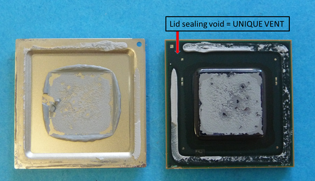 My customer is making a post-reflow washing which is mandatory in their manufacturing process. This washing involves some chemicals that remain trapped within the metal lid cavity. They observed that our FC-BGA package has a single vent opening in the lid which prevents all chemical traces to be removed. See the picture below.