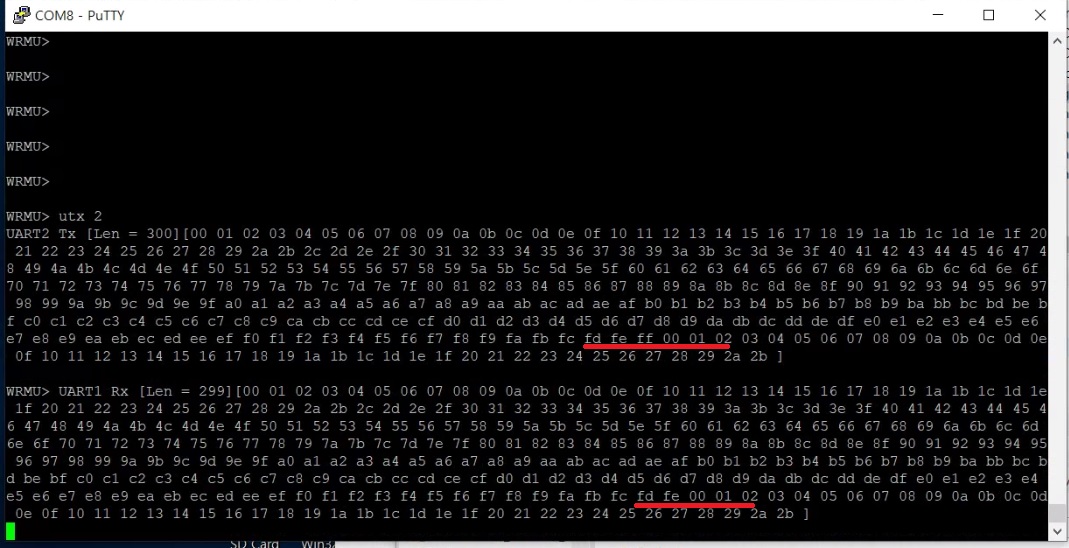 I sent data ( 0 ~ 0xff and 0 ~ 2b (300 byes) from UART2 -> Looped UART1 but not received only 0xff.