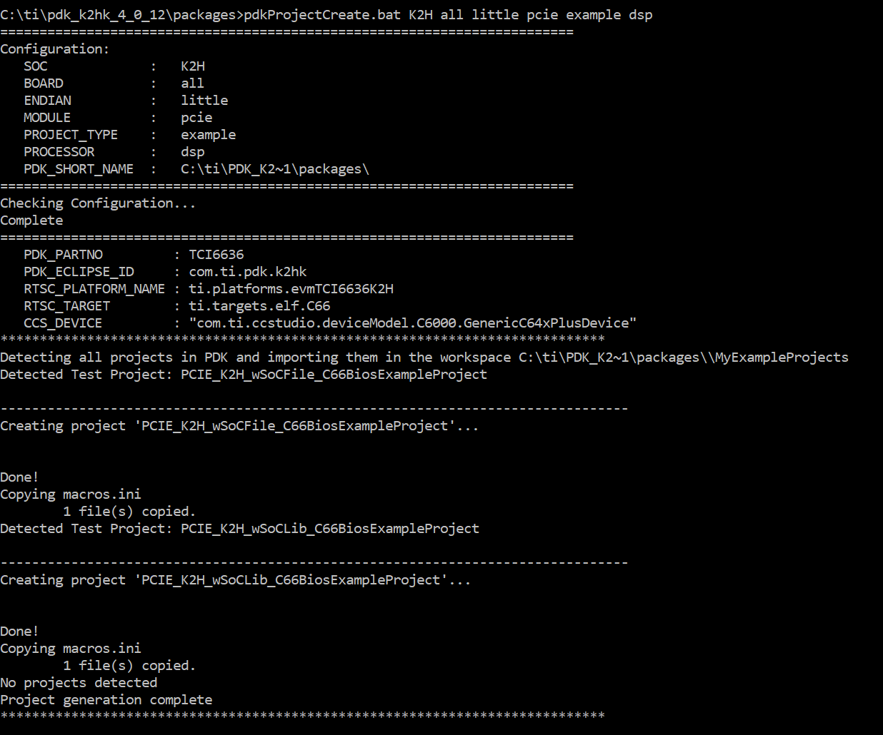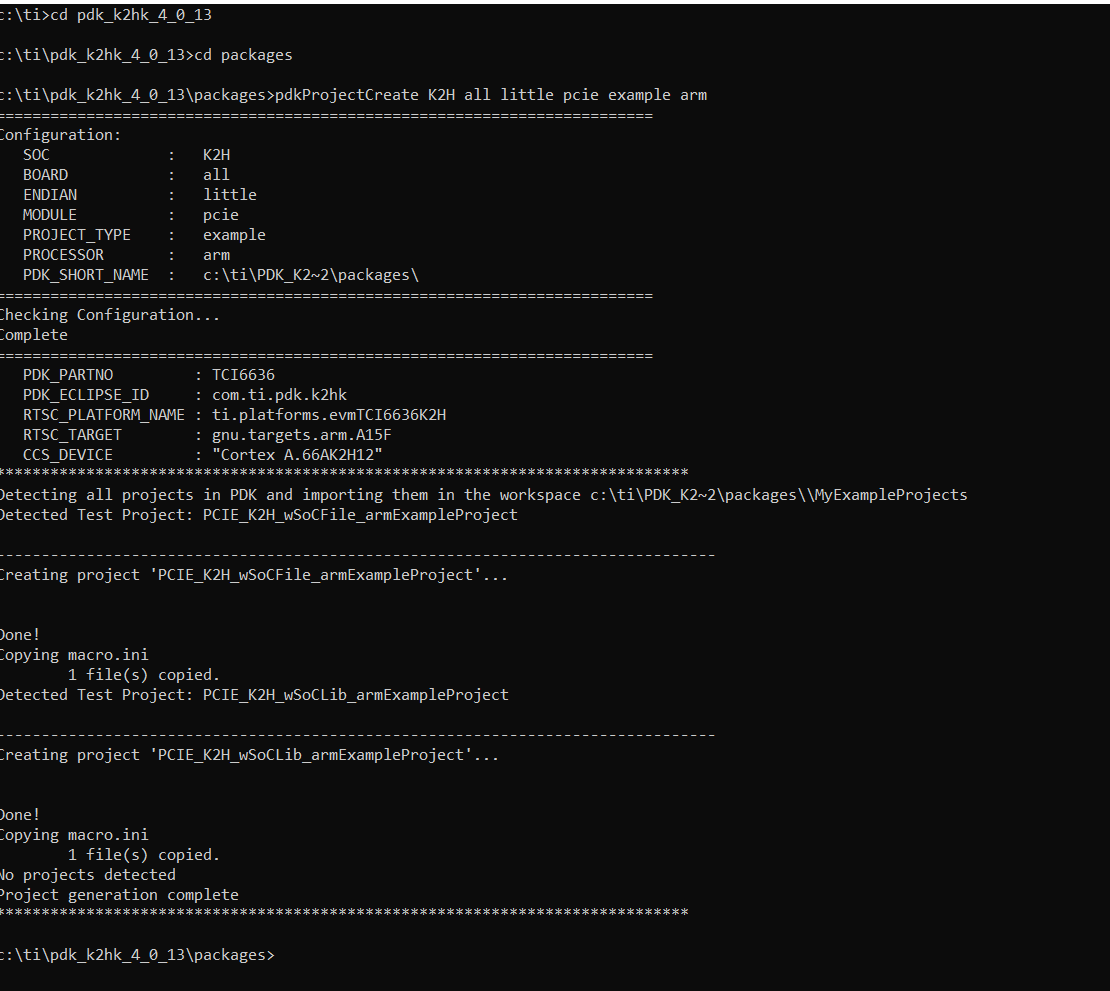 - Run C:\ti\pdk_k2hk_4_0_12\packages> pdkProjectCreate.bat K2H all little pcie example dsp