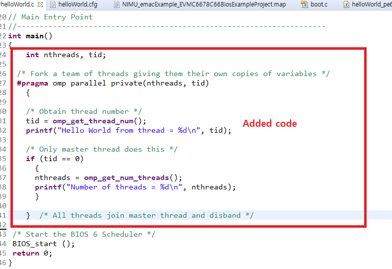 /* * helloWorld_bios6.c * * TCP/IP Stack 'Hello World!' Example ported to use BIOS6 OS. * * Copyright (C) 2007, 2011 Texas Instruments Incorporated - http://www.ti.com/ * * * Redistribution and use in source and binary forms, with or without * modification, are permitted provided that the following conditions * are met: * * Redistributions of source code must retain the above copyright * notice, this list of conditions and the following disclaimer. * * Redistributions in binary form must reproduce the above copyright * notice, this list of conditions and the following disclaimer in the * documentation and/or other materials provided with the * distribution. * * Neither the name of Texas Instruments Incorporated nor the names of * its contributors may be used to endorse or promote products derived * from this software without specific prior written permission. * * THIS SOFTWARE IS PROVIDED BY THE COPYRIGHT HOLDERS AND CONTRIBUTORS * "AS IS" AND ANY EXPRESS OR IMPLIED WARRANTIES, INCLUDING, BUT NOT * LIMITED TO, THE IMPLIED WARRANTIES OF MERCHANTABILITY AND FITNESS FOR * A PARTICULAR PURPOSE ARE DISCLAIMED. IN NO EVENT SHALL THE COPYRIGHT * OWNER OR CONTRIBUTORS BE LIABLE FOR ANY DIRECT, INDIRECT, INCIDENTAL, * SPECIAL, EXEMPLARY, OR CONSEQUENTIAL DAMAGES (INCLUDING, BUT NOT * LIMITED TO, PROCUREMENT OF SUBSTITUTE GOODS OR SERVICES; LOSS OF USE, * DATA, OR PROFITS; OR BUSINESS INTERRUPTION) HOWEVER CAUSED AND ON ANY * THEORY OF LIABILITY, WHETHER IN CONTRACT, STRICT LIABILITY, OR TORT * (INCLUDING NEGLIGENCE OR OTHERWISE) ARISING IN ANY WAY OUT OF THE USE * OF THIS SOFTWARE, EVEN IF ADVISED OF THE POSSIBILITY OF SUCH DAMAGE. * */ //-------------------------------------------------------------------------- // IP Stack 'Hello World!' Example // // This is a skeleton application, intended to provide application // programmers with a basic Stack setup, to which they can start // adding their code. // // To test it as is, use with helloWorld.exe from \winapps directory // #include <omp.h> #include <stdio.h> #include <ti/ndk/inc/netmain.h> #include <ti/transport/ndk/nimu/example/helloWorld/src/nimu_cppi_qmss_iface.h> #ifdef _TMS320C6X #include <ti/csl/csl_chipAux.h> #endif #include <ti/csl/csl_psc.h> #include <ti/csl/csl_pscAux.h> #ifdef __ARM_ARCH_7A__ #include <ti/csl/cslr_msmc.h> #include <ti/csl/csl_bootcfgAux.h> #endif /* BIOS6 include */ #include <ti/sysbios/BIOS.h> #ifdef _TMS320C6X #include <ti/sysbios/family/c64p/Hwi.h> #include <ti/sysbios/family/c64p/EventCombiner.h> #else #include <ti/sysbios/family/arm/gic/Hwi.h> #include <ti/sysbios/family/arm/a15/Mmu.h> #endif /* Platform utilities include */ //#include "ti/platform/platform.h" //#include "ti/platform/resource_mgr.h" /* Platform Information - we will read it form the Platform Library */ //platform_info gPlatformInfo; //--------------------------------------------------------------------------- // Title String // char *VerStr = "\nTCP/IP Stack 'Hello World!' Application\n\n"; // Our NETCTRL callback functions static void NetworkOpen(); static void NetworkClose(); static void NetworkIPAddr( uint32_t IPAddr, uint32_t IfIdx, uint32_t fAdd ); // Fun reporting function static void ServiceReport( uint32_t Item, uint32_t Status, uint32_t Report, void* hCfgEntry ); // External references extern int dtask_udp_hello(); //--------------------------------------------------------------------------- // Configuration // char *HostName = "tidsp"; char *LocalIPAddr = "192.168.1.4"; char *LocalIPMask = "255.255.255.0"; // Not used when using DHCP char *GatewayIP = "192.168.1.1"; // Not used when using DHCP char *DomainName = "demo.net"; // Not used when using DHCP char *DNSServer = "0.0.0.0"; // Used when set to anything but zero // Simulator EMAC Switch does not handle ALE_LEARN mode, so please configure the // MAC address of the PC where you want to launch the webpages and initiate PING to NDK */ Uint8 clientMACAddress [6] = {0xd4, 0xbe, 0xd9, 0x3d, 0xb6, 0xb8}; /* MAC address for my PC */ //--------------------------------------------------------------------- // Main Entry Point //--------------------------------------------------------------------- int main() { int nthreads, tid; /* Fork a team of threads giving them their own copies of variables */ #pragma omp parallel private(nthreads, tid) { /* Obtain thread number */ tid = omp_get_thread_num(); printf("Hello World from thread = %d\n", tid); /* Only master thread does this */ if (tid == 0) { nthreads = omp_get_num_threads(); printf("Number of threads = %d\n", nthreads); } } /* All threads join master thread and disband */ /* Start the BIOS 6 Scheduler */ BIOS_start (); return 0; } // // Main Thread // int StackTest() { int rc; int i; void* hCfg; NIMU_QMSS_CFG_T qmss_cfg; NIMU_CPPI_CFG_T cppi_cfg; #ifdef __ARM_ARCH_7A__ /* Add MMU entries for MMR's required for PCIE example */ Uint32 privid, index; CSL_MsmcRegs *msmc = (CSL_MsmcRegs *)CSL_MSMC_CFG_REGS; Mmu_DescriptorAttrs attrs; extern char ti_sysbios_family_arm_a15_Mmu_Module_State_0_secondLevelTableBuf_1__A; uint32_t addr = (uint32_t)&ti_sysbios_family_arm_a15_Mmu_Module_State_0_secondLevelTableBuf_1__A; Mmu_initDescAttrs(&attrs); attrs.type = Mmu_DescriptorType_TABLE; attrs.shareable = 0; // non-shareable attrs.accPerm = 1; // read/write at any privelege level attrs.attrIndx = 0; // Use MAIR0 Register Byte 3 for // determining the memory attributes // for each MMU entry // Update the first level table's MMU entry for 0x80000000 with the // new attributes. Mmu_setFirstLevelDesc((Ptr)0x40000000, (UInt64)addr, &attrs); // Set up SES & SMS to make all masters coherent for (privid = 0; privid < 16; privid++) { for (index = 0; index < 8; index++) { uint32_t ses_mpaxh = msmc->SES_MPAX_PER_PRIVID[privid].SES[index].MPAXH; uint32_t sms_mpaxh = msmc->SMS_MPAX_PER_PRIVID[privid].SMS[index].MPAXH; if (CSL_FEXT (ses_mpaxh, MSMC_SES_MPAXH_0_SEGSZ) != 0) { // Clear the "US" bit to make coherent. This is at 0x80. ses_mpaxh &= ~0x80; msmc->SES_MPAX_PER_PRI