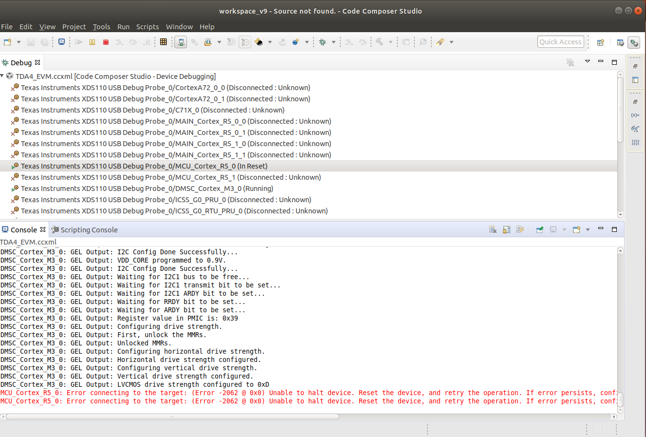 Error loading "/home/tda4dev/psdk_rtos_auto_j7_06_00_00_00/pdk/packages/ti/drv/sciclient/tools/ccsLoadDmsc/j721e/sciclient_ccs_init_mcu1_0_release.xer5f": Timed out after 20000ms while waiting for target to halt after an auto-run to "main (/home/tda4dev/psdk_rtos_auto_j7_06_00_00_00/pdk/packages/ti/drv/sciclient/tools/ccsLoadDmsc/j721e/launch.js#125) (/home/tda4dev/psdk_rtos_auto_j7_06_00_00_00/pdk/packages/ti/drv/sciclient/tools/ccsLoadDmsc/j721e/launch.js#125)