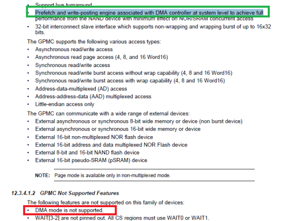 I believe the DMA mode not supported relates to the Prefetch and Write-Posting Engine. An unsupported feature is for the Prefetch and Write-Posting Engine to automatically trigger a DMA transfer when the FIFO gets low or full.