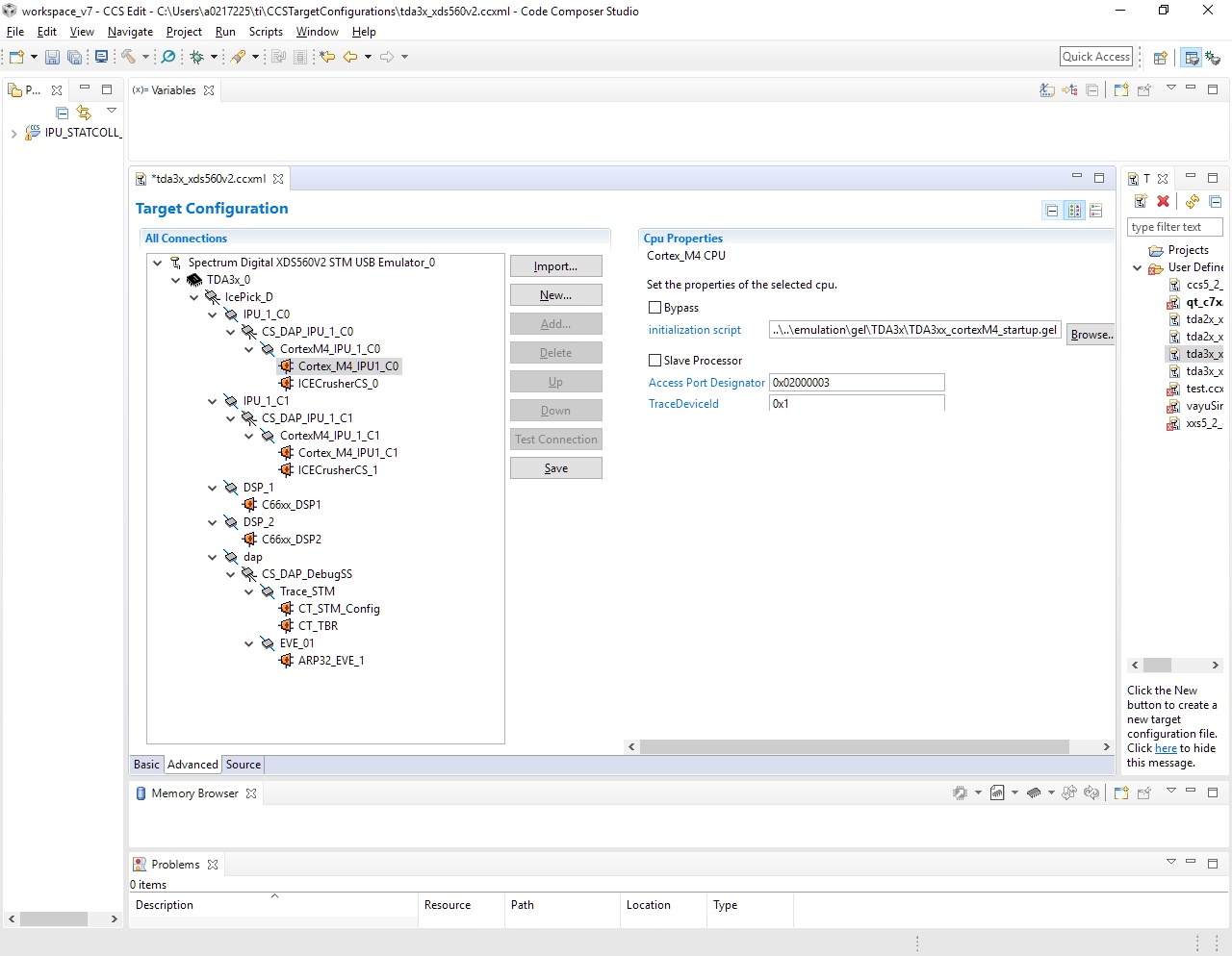 ARP32_EVE_1: Trouble Reading Memory Block at 0xa1000000 on Page 1 of Length 0x4: (Error -1065 @ 0xA1000000) Unable to access device memory. Verify that the memory address is in valid memory. If error persists, confirm configuration, power-cycle board, and/or try more reliable JTAG settings (e.g. lower TCLK). (Emulation package 8.3.0.00003) ARP32_EVE_1: File Loader: Verification failed: Target failed to read 0xA1000000@Data ARP32_EVE_1: GEL: File: C:\PROCESSOR_SDK_VISION_03_07\vision_sdk\binaries\apps\tda3xx_rvp_bios_all\vision_sdk\bin\tda3xx-rvp\vision_sdk_arp32_1_release.xearp32F: Load faile