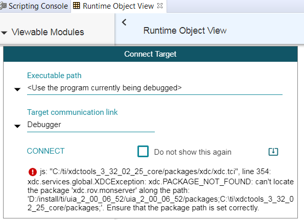 Please see similar thread: http://e2e.ti.com/support/microcontrollers/other/f/908/t/799750. Please try to use ROV classic instead of Runtime Object View as this older version of XDCTools is not supported by the newer ROV. The view will be slightly different but the options should be the same.