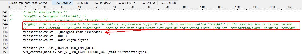 But when I now look inside the function SF25FL_ConfigMode_Write, which is called by SF25FL_bufferWrite, then I don’t find any byte swap of the address, the transaction.txBuf pointer points to a non-swapped variable. See here a comment that I added in the red rectangle: