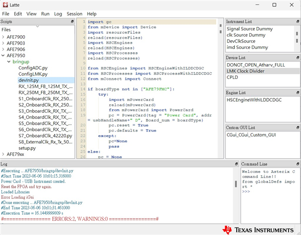 setupParams.skipLmk = True ## Initiates AFE79xx Bring-up AFE.deviceBringup() AFE.TOP.overrideTdd(15,3,15)