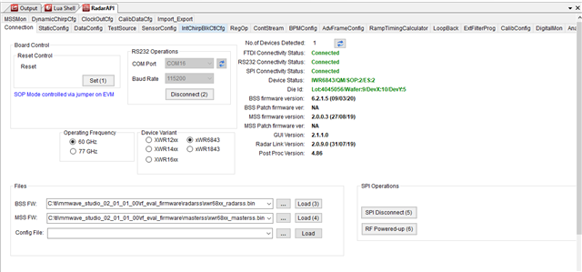 [20:53:57] ***Script completed successfully.*** [20:54:02] [RadarAPI]: Opening Gpio Control Port() [20:54:02] [RadarAPI]: Status: Passed [20:54:02] [RadarAPI]: Opening Board Control Port() [20:54:02] [RadarAPI]: Status: Passed [20:54:03] [RadarAPI]: ar1.FullReset() [20:54:03] [RadarAPI]: Status: Passed [20:54:04] [RadarAPI]: Closing Board Control Port() [20:54:04] [RadarAPI]: Status: Passed [20:54:04] [RadarAPI]: Closing Gpio Control Port() [20:54:04] [RadarAPI]: Status: Passed [20:54:04] [RadarAPI]: ar1.SOPControl(2) [20:54:04] [RadarAPI]: Status: Passed [20:54:05] [RadarAPI]: ar1.Connect(16,115200,1000) [20:54:06] [RadarAPI]: ar1.Calling_IsConnected() [20:54:07] [RadarAPI]: ar1.SelectChipVersion("IWR6843") [20:54:07] [RadarAPI]: Status: Passed [20:54:07] [RadarAPI]: ar1.frequencyBandSelection("60G") [20:54:07] [RadarAPI]: ar1.SelectChipVersion("IWR6843") [20:54:07] [RadarAPI]: Status: Passed [20:54:07] Device Status : IWR6843/QM/SOP:2/ES:2 [20:54:07] [RadarAPI]: ar1.SaveSettings('C:\Users\Usman\AppData\Roaming\RSTD\ar1gui.ini') [20:54:10] [RadarAPI]: ar1.DownloadBSSFw("C:\\ti\\mmwave_studio_02_01_01_00\\rf_eval_firmware\\radarss\\xwr68xx_radarss.bin") [20:54:10] [RadarAPI]: Downloading BSS ROM RPRC Binary.. [20:54:58] [RadarAPI]: ar1.GetBSSFwVersion() [20:54:58] [RadarAPI]: BSSFwVersion:(06.02.01.05 (09/03/20)) [20:55:02] [RadarAPI]: ar1.DownloadMSSFw("C:\\ti\\mmwave_studio_02_01_01_00\\rf_eval_firmware\\masterss\\xwr68xx_masterss.bin") [20:55:02] [RadarAPI]: Downloading MSS RPRC Binary.. [20:55:21] [RadarAPI]: ar1.GetMSSFwVersion() [20:55:21] [RadarAPI]: MSSFwVersion:(02.00.00.03 (27/08/19)) [20:55:22] [RadarAPI]: ar1.PowerOn(0, 1000, 0, 0) [20:55:22] [RadarAPI]: Status: Passed [20:55:23] MSS power up done async event received! [20:55:24] [RadarAPI]: ar1.SelectChipVersion("IWR6843") [20:55:24] [RadarAPI]: Status: Passed [20:55:24] [RadarAPI]: ar1.SelectChipVersion("IWR6843") [20:55:24] [RadarAPI]: Status: Passed [20:55:24] Device Status : IWR6843/QM/SOP:2/ES:2 [20:55:24] [RadarAPI]: ar1.RfEnable() [20:55:24] BSS power up done async event received! [20:55:24] [RadarAPI]: Status: Passed [20:55:25] [RadarAPI]: ar1.GetMSSFwVersion() [20:55:25] [RadarAPI]: MSSFwVersion:(02.00.00.03 (27/08/19)) [20:55:25] [RadarAPI]: ar1.GetBSSFwVersion() [20:55:25] [RadarAPI]: BSSFwVersion:(06.02.01.05 (09/03/20)) [20:55:33] [RadarAPI]: ar1.ChanNAdcConfig(1, 1, 0, 1, 1, 1, 1, 2, 1, 0) [20:55:33] [RadarAPI]: Status: Passed [20:55:34] [RadarAPI]: ar1.LPModConfig(0, 0) [20:55:34] [RadarAPI]: Status: Passed [20:55:35] [RadarAPI]: ar1.RfInit() [20:55:35] RF Init async event received! [20:55:35] [RadarAPI]: Status: Passed [20:55:35] [RadarAPI]: Time stamp, Temperture: 10678,44; APLL Status, Update: 1, 0; SynthVCO1 Status, Update: 1, 1; SynthVCO2 Status, Update: 1, 1; LODist Status, Update: 1, 1; RxADCDC Status, Update: 1, 1; HPFcutoff Status, Update: 1, 1; LPFcutoff Status, Update: 1, 1; PeakDetector Status, Update: 1, 1; TxPower Status, Update: 1, 1; RxGain Status, Update: 1, 1; TxPhase Status, Update: 1, 1; RxIQMM Status, Update: 1, 1; [20:55:38] [RadarAPI]: ar1.DataPathConfig(513, 1216644097, 0) [20:55:38] [RadarAPI]: Status: Passed [20:55:39] [RadarAPI]: ar1.LvdsClkConfig(1, 1) [20:55:39] [RadarAPI]: Status: Passed [20:55:40] [RadarAPI]: ar1.LVDSLaneConfig(0, 1, 1, 0, 0, 1, 0, 0) [20:55:40] [RadarAPI]: Status: Passed [20:55:44] [RadarAPI]: ar1.ProfileConfig(0, 60, 100, 6, 60, 0, 0, 0, 0, 0, 0, 29.982, 0, 256, 10000, 0, 131072, 30) [20:55:44] [RadarAPI]: Status: Passed [20:55:45] [RadarAPI]: ar1.ChirpConfig(0, 0, 0, 0, 0, 0, 0, 1, 0, 0) [20:55:45] [RadarAPI]: Status: Passed [20:55:46] Test Source Already Disabled...!!! [20:55:46] [RadarAPI]: ar1.DisableTestSource(0) [20:55:46] [RadarAPI]: Status: Passed [20:55:46] [RadarAPI]: ar1.FrameConfig(0, 0, 8, 128, 40, 0, 0, 1) [20:55:46] [RadarAPI]: Status: Passed [20:55:48] [RadarAPI]: ar1.GetCaptureCardDllVersion() [20:55:48] [RadarAPI]: Sending dll_version command to DCA1000 [20:55:48] [RadarAPI]: [20:55:48] DLL Version : 1.0 [20:55:48] [RadarAPI]: ar1.SelectCaptureDevice("DCA1000") [20:55:48] [RadarAPI]: Status: Passed [20:55:50] [RadarAPI]: ar1.CaptureCardConfig_EthInit("192.168.33.30", "192.168.33.180", "12:34:56:78:90:12", 4096, 4098) [20:55:50] [RadarAPI]: ar1.CaptureCardConfig_Mode(1, 2, 1, 2, 3, 30) [20:55:50] [RadarAPI]: ar1.CaptureCardConfig_PacketDelay(25) [20:55:51] [RadarAPI]: ar1.CaptureCardConfig_EthInit("192.168.33.30", "192.168.33.180", "12:34:56:78:90:12", 4096, 4098) [20:55:51] [RadarAPI]: ar1.CaptureCardConfig_Mode(1, 2, 1, 2, 3, 30) [20:55:51] [RadarAPI]: ar1.CaptureCardConfig_PacketDelay(25) [20:55:53] [RadarAPI]: ar1.CaptureCardConfig_EthInit("192.168.33.30", "192.168.33.180", "12:34:56:78:90:12", 4096, 4098) [20:55:53] [RadarAPI]: ar1.CaptureCardConfig_Mode(1, 2, 1, 2, 3, 30) [20:55:53] [RadarAPI]: ar1.CaptureCardConfig_PacketDelay(25)