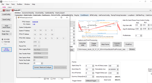 On the 'SensorConfig' tab inside mmWave Studio, when I select 'SetUp DCA1000' and then click 'Connect, Reset and Configure', nothing happens. It seems like the ethernet connection is not working. Below I have attached (i) pictures of my setup, (ii) screenshots of mmWave studio sofware, (iii) screenshot of ethernet connection settings, and (iv) mmWave Studio output.