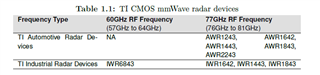 The wide range of TI highly integrated 77GHz and 60GHz CMOS TI mmWave sensors are tabulated in the table below :