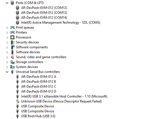 I'm currently using the AWR1443BOOST Rev A with the DCA1000EVM board. I'm trying to use the mmWave studio to run commands, but whenever i plug in the device a message pops up that USB device is not recognized. Under the device manager it says "Unknown USB Device (Device Description Request Failed)". I've connected jumpers to SOP0 and SOP1 and the NERR_OUT led is red. I've also double checked that the power supplies and cables all work (also tested it against the IWR1843BOOST boards with their respective DCA1000EVM boards). I've tried restarting the computer, updating the drivers, trying another computer and trying other cables. Nothing seems to work. I'm hoping there is no damage to the board but I am unsure. I was using it just 1 hour ago, and then when I tried to plug it in again and restart my setup it started throwing this issue.