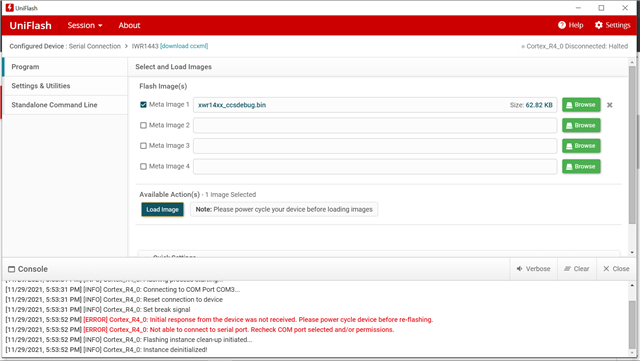 We are running to an error when we try to flash an image onto the board using UniFlash. Whenever we try to load the image, we get this error: