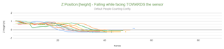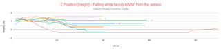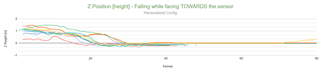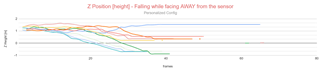 The following graphs show a clear distinction between the falling event when occurring towards the sensor and away from the sensor. When facing towards the sensor, all results (12/12) have the same outcome: the centroid's height goes from 1.0m to under 0m. The "landing" height (after the fall) is always between the range of [-0.2m ; 0m], which is really precise. When facing AWAY from the sensor, most of the results show that the falling event has not been tracked properly, where the "landing" Z final positions are between the range of [-0.35m ; 1.6m]